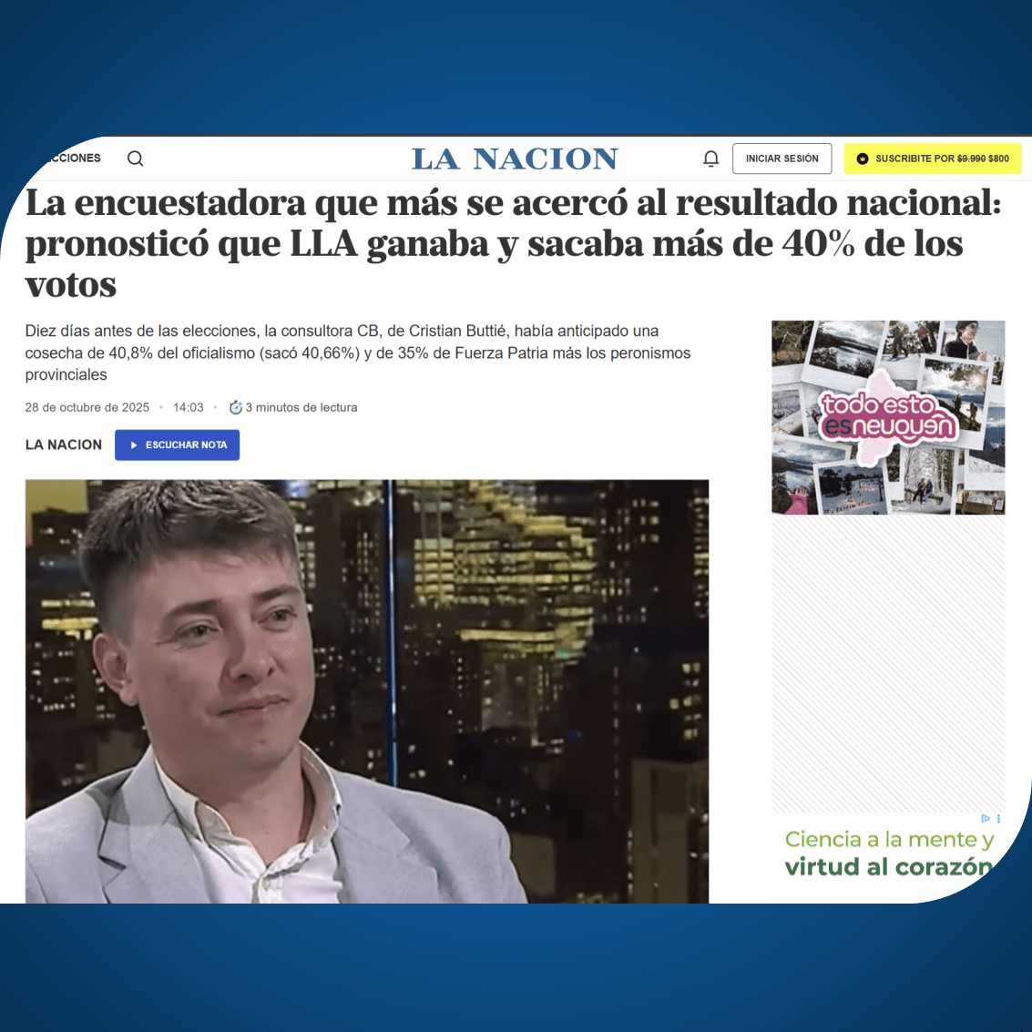 CB CONSULTORA OPINIÓN PÚBLICA es una empresa líder en el estudio del clima social y proyección de escenarios electorales. A la vanguardia internacional en encuestas de opinión, aplicamos herramientas de última tecnología que perfeccionan el resultado de nuestros estudios. En los últimos años nuestra firma se ha posicionado entre las encuestadoras más eficientes de Argentina y sudamérica.